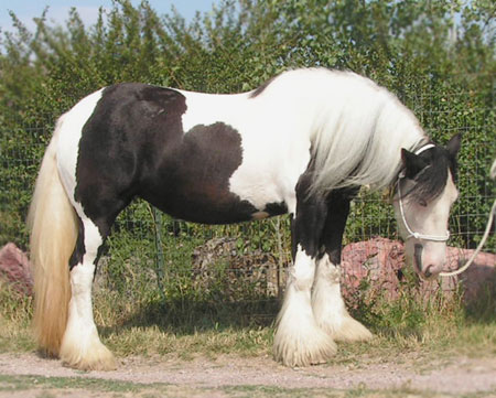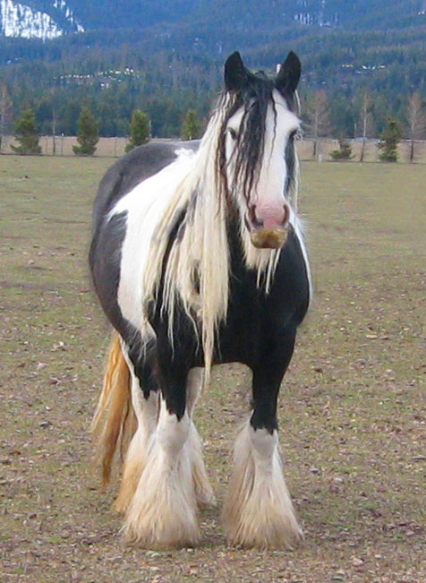 Big Sky Penny is the smallest mare in our Gypsy Vanner herd standing only 14.0 hands tall. After searching for many months, she was imported from England in the summer of 2004. Penny is an outstanding little mare with tons of Gypsy type and unbelievable feather. She has one bright blue eye and very attractive markings.